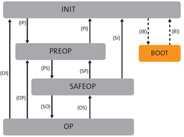 每个 EtherCAT 从站都有状态机,控制其运行状态: